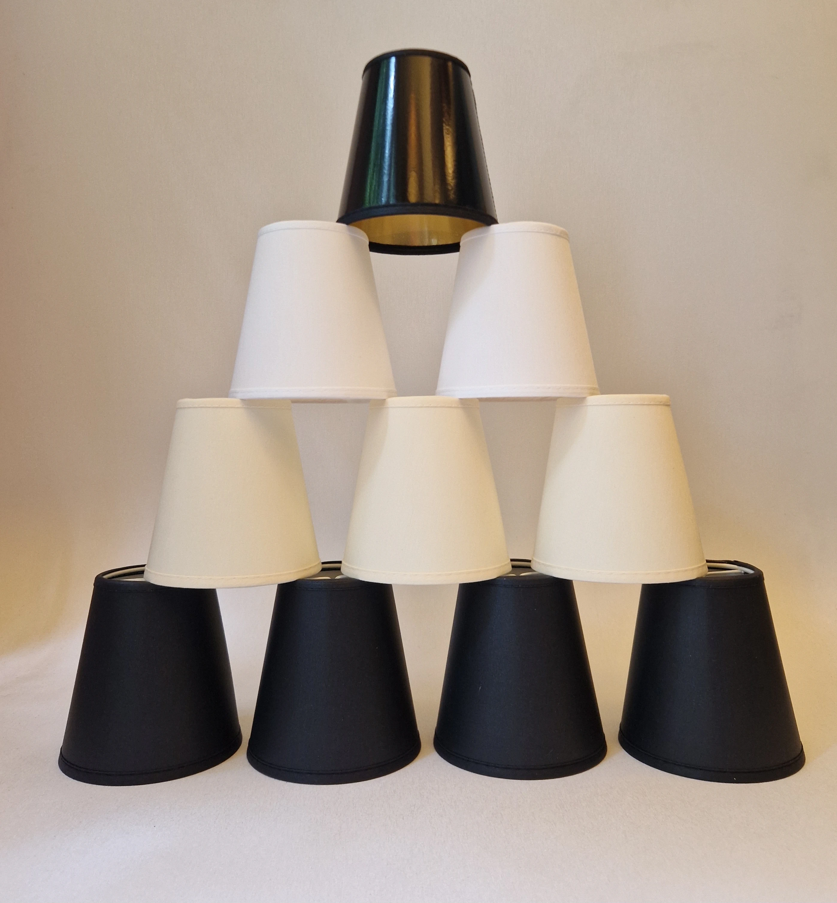 Mały abażur na żarówkę świecową z szytą lamówką. W naszej kolekcji dostępny w jednym rozmiarze. Wykonujemy go z chintzu w kolorze białym, kremowym i czarnym lub z folii lack, czarnej na zewnątrz, złotej od środka.